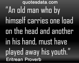 • Tomorrow is pregnant and no-one knows what she will give birth to. • A termite grows up in dry wood, and yet comes to maturity. • If an enemy learns your dance, he/she dances it the crooked way. • An old man who by himself carries one load on the head and another in his hand, must have played away his youth.