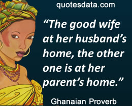• A healthy person who begs for food is an insult to a generous farmer. • When a woman is hungry, she says, "Roast something for the children that they may eat." • The good wife at her husband's home, the other one is at her parent's home. • A woman is a flower in a garden; her husband is the fence around it.